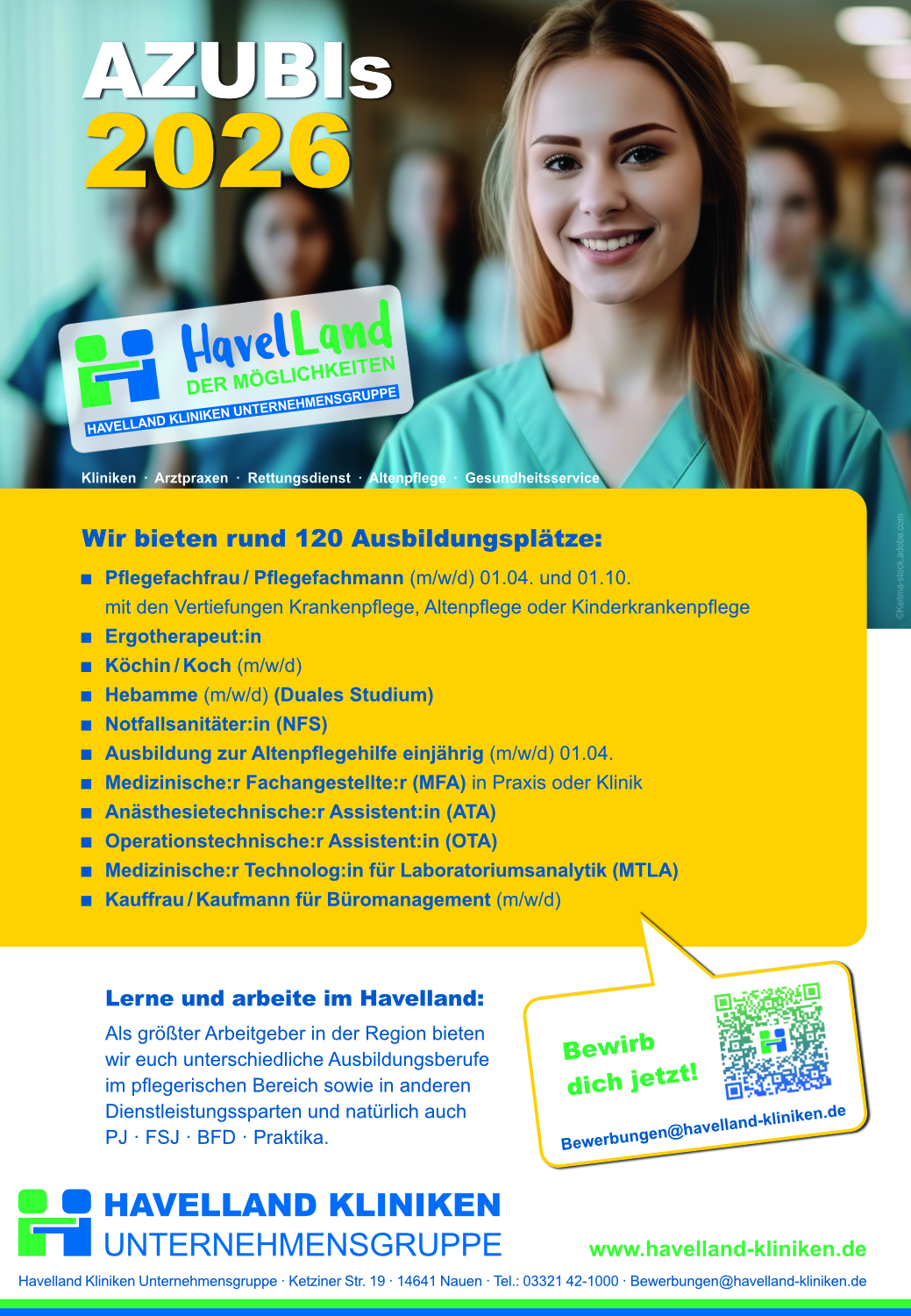 Die Havelland Kliniken Unternehmensgruppe ist einer der größten Arbeitgeber der Region. Unsere rund 2400 Mitarbeiter*innen betreuen Menschen aus dem gesamten Havelland und der angrenzenden Region im Bereich der medizinischen und pflegerischen Versorgung, in Arztpraxen und in der Altenpflege. Derzeit durchlaufen hier mehr als 200 junge Männer und Frauen ihre Ausbildung in den verschiedensten Berufszweigen.